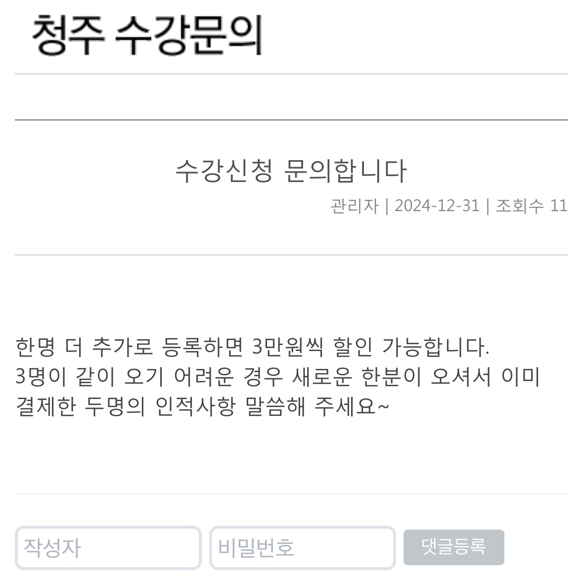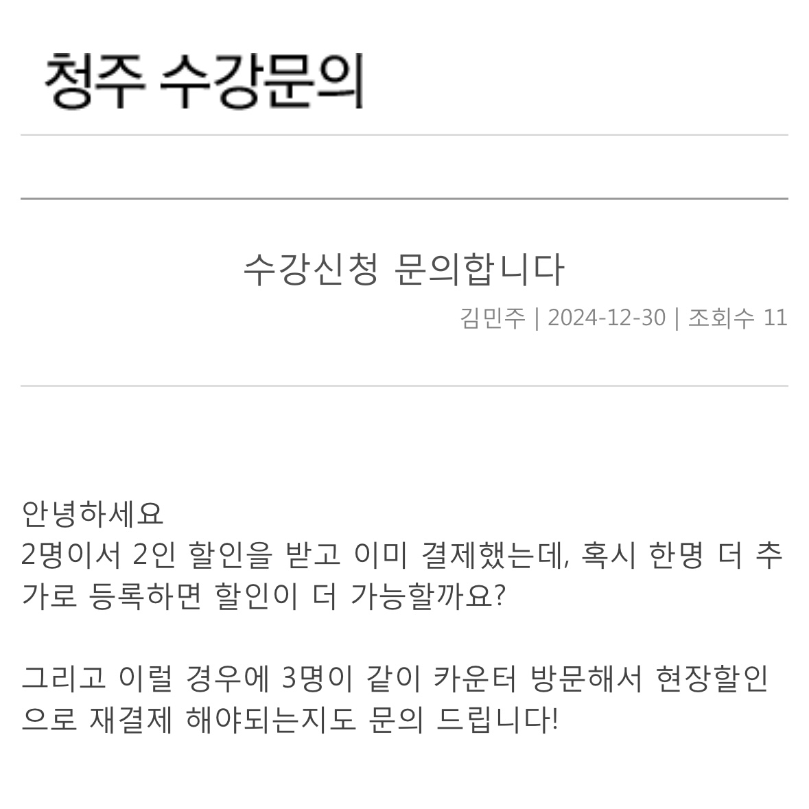 이번에 새로 등록하러 간 친구가 할인이 안된다고 얘기를 들었다고 해서 왜 안되는건지 여쭤보려고 문의 남깁니다!